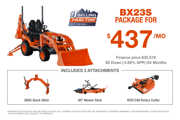 BX23SLB-R14-1. PAYMENT INCLUDES DOC FEE AND STATE OF OHIO UCC. PAYMENT DOES NOT INCLUDE TAX, INSURANCE, EXTENDED WARRANTY, OR MAINTENANCE. OFFER VALID ON IN STOCK MODELS ONLY. SUBJECT TO APPROVAL.